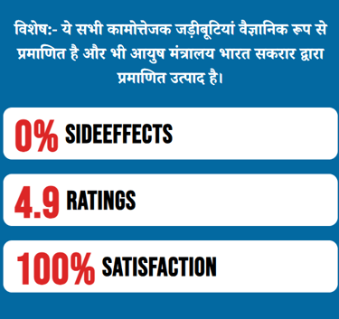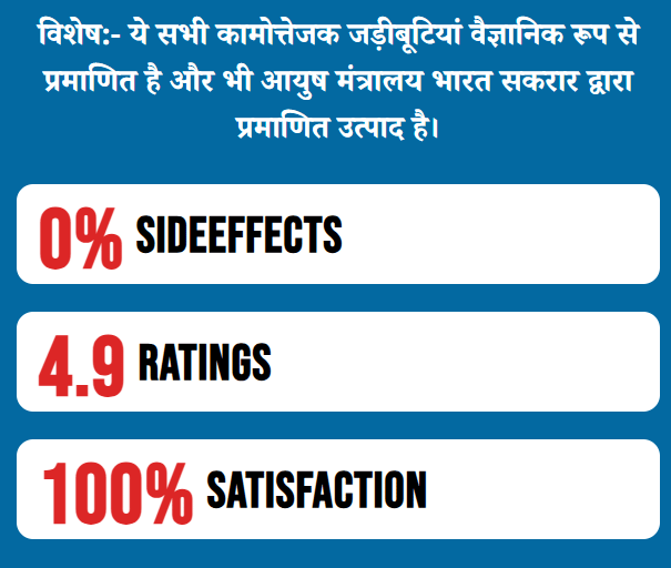 दुनिया भर के शोधकर्ताओं ने ये माना है की पुरुषों में शीघ्रपतन, इरेक्टाइल डिस्फक्शन जिसे आम भाषा में ढीले लिंग की समस्या कहते है यह पुरुष की मर्दानगी की सबसे गम्भीर समस्या में से एक है. इसलिए लिए Vatsayan Gold Capsule एक भरोसेमंद है। इसे खाने से टेस्टोस्टेरोन लेवल बढ़ता है शरीर में ऊर्जा की वृद्धि होती है, बेजान पड़ी लिंग की नसों में जान आने लगती है और ढीले लिंग से राहत मिलती है, उन पुरुषों को डरने की जरुरत नहीं है जो डॉक्टर कंसल्टेशन से घबराते या शर्माते है। क्यांकि Vatsayan Gold Capsule भारत सरकार के आयुष मंत्रालय से प्रमाणित है। और इसका कोई भी नकारात्मक प्रभाव नहीं है